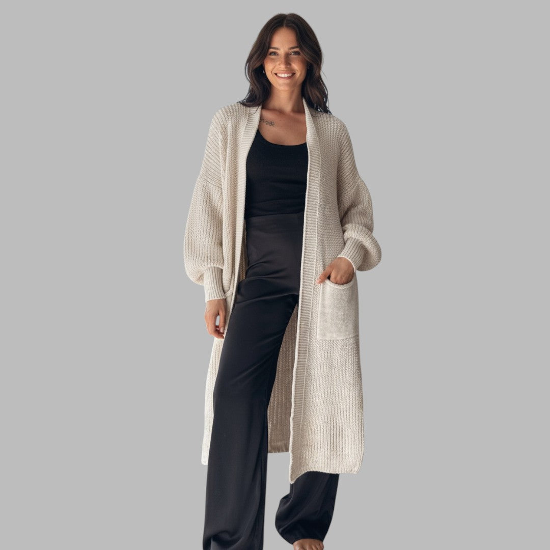 A soft and versatile layer, this long cardigan offers a relaxed silhouette for everyday comfort. The neutral beige tone adds timeless elegance, while the lightweight knit texture makes it ideal for layering across different seasons and casual occasions.
